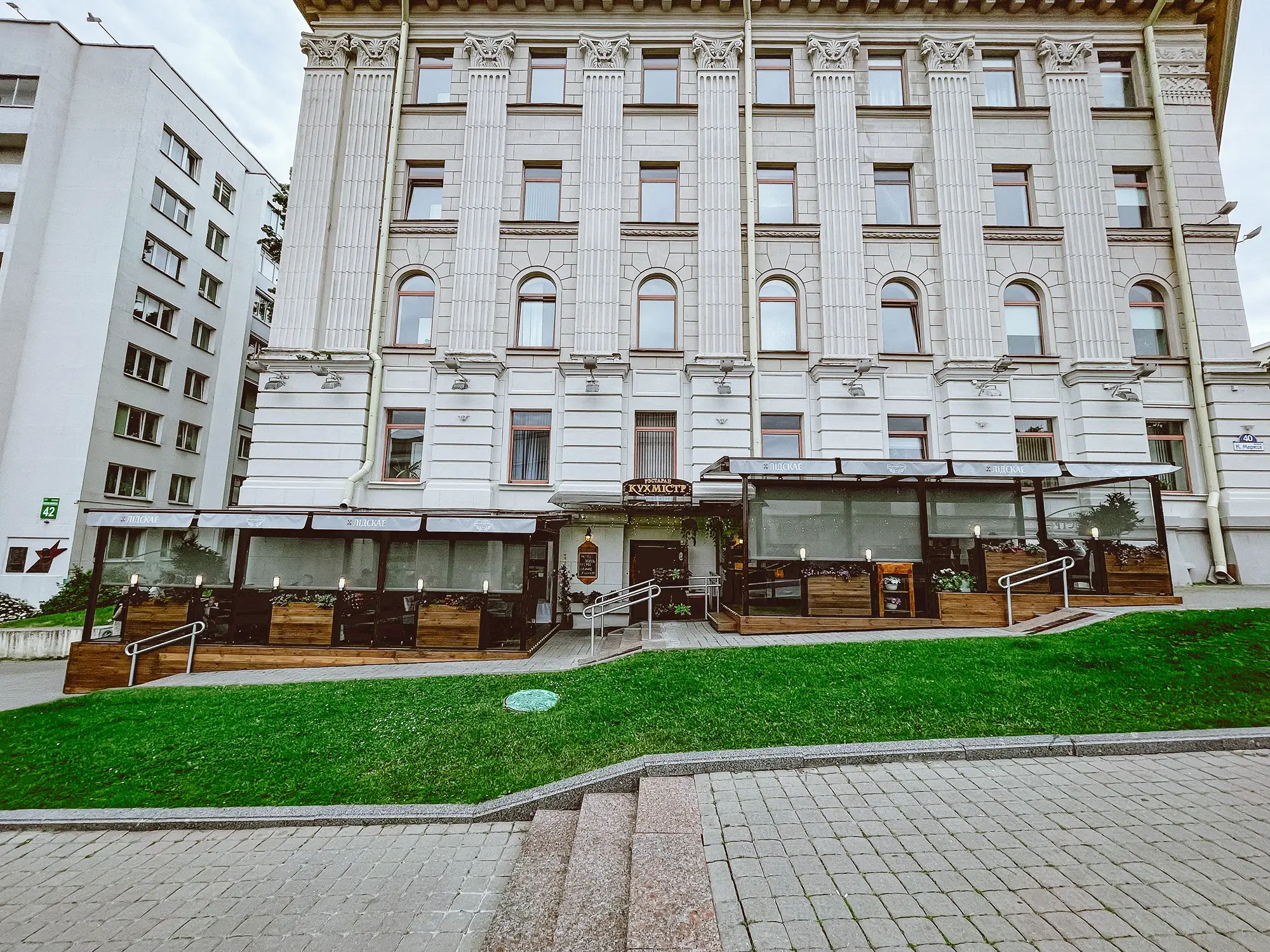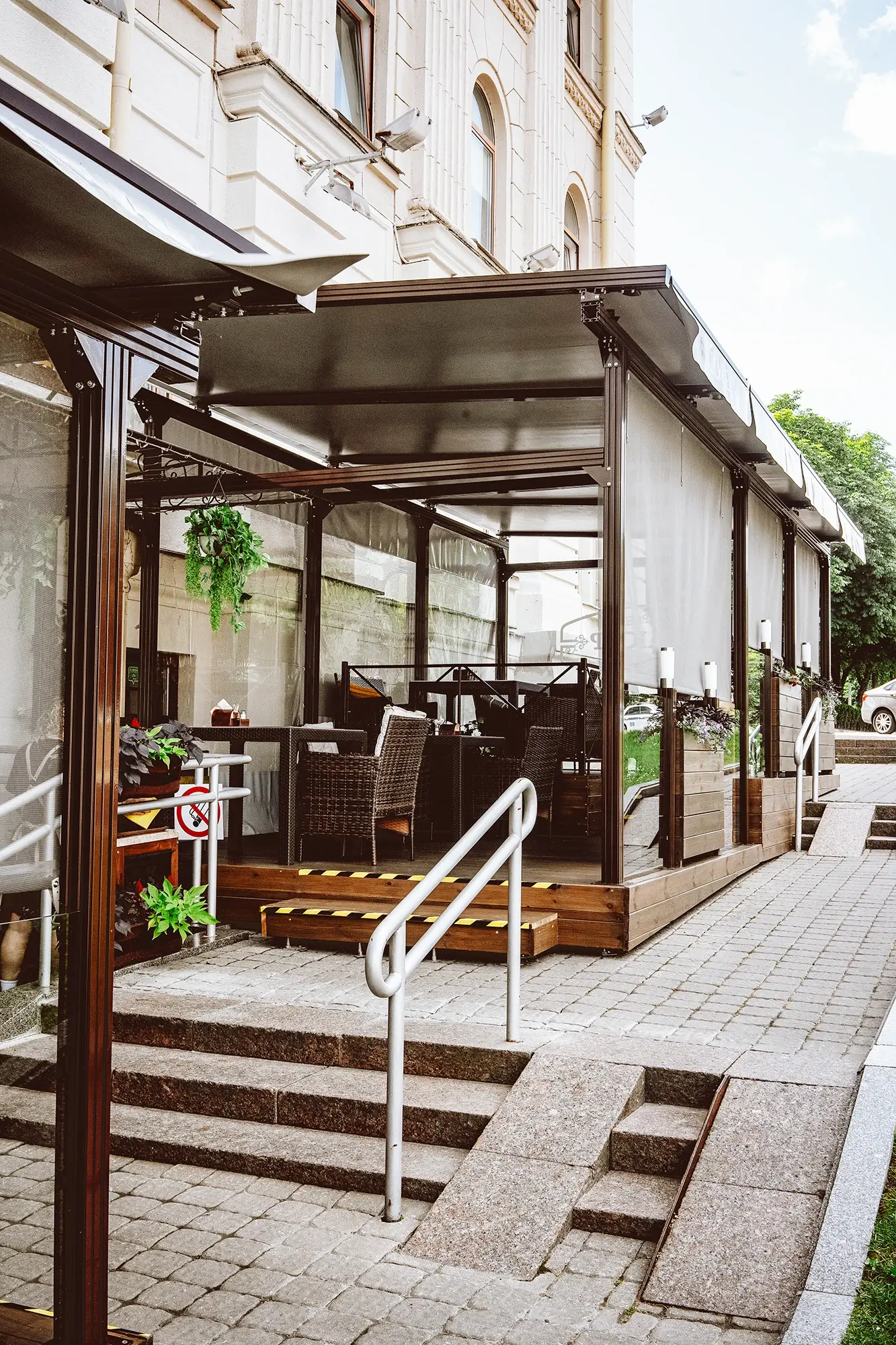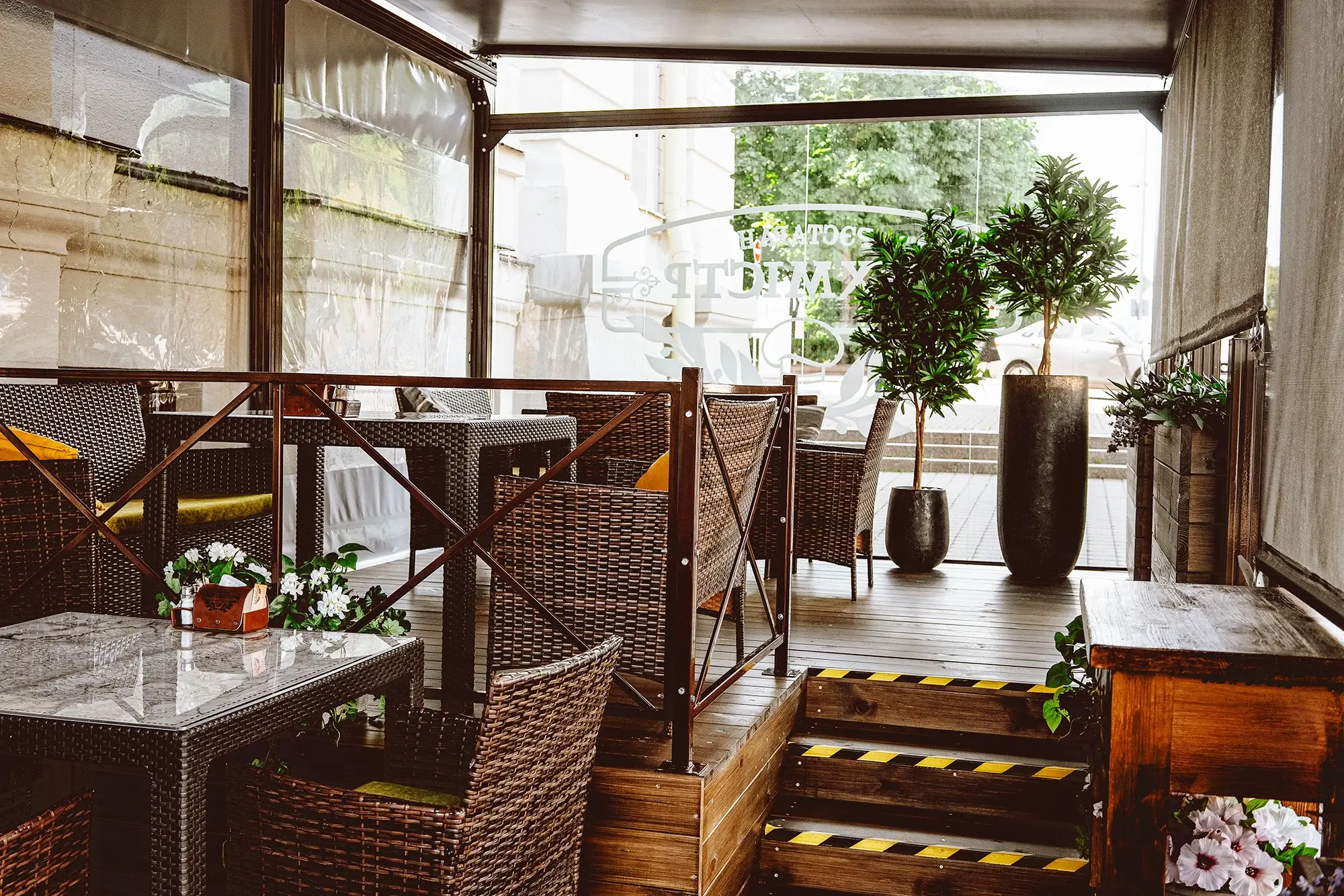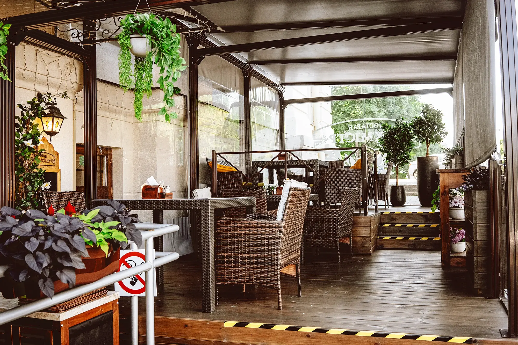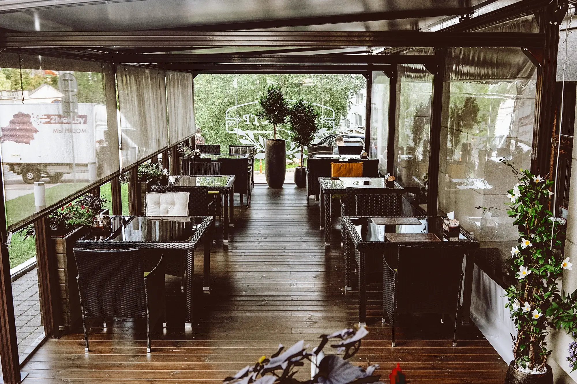 На нашей комфортной летней террасе, дизайн которой в мае 2024 г. мы полностью обновили, можно спокойно, никуда не торопясь, нежиться под ласковым солнцем. Не опасаясь ни ветра, ни дождя. Любуясь прекрасным видом, вдыхая закатный воздух и разглядывая по-летнему одетых прохожих. И старый, но такой живой и зелёный, Александровский сквер. Потягивая через соломинку один из наших лимонадов. Или безалкогольный мохито, или наш фирменный натуральный квас. Хотите – хлебный, хотите – яблочный. Или клюквенный морс. Хотя, конечно, мы никак не ограничиваем Вашего аппетита, и всё наше основное меню – к Вашим услугам и здесь. Спешите воспользоваться невинными благами нашего короткого лета, пока оно снова не покинуло нас.