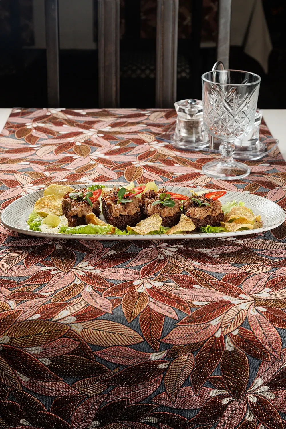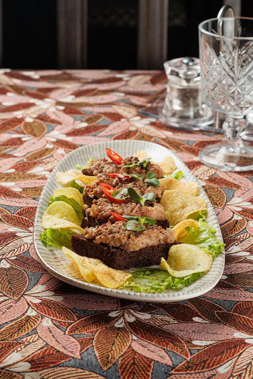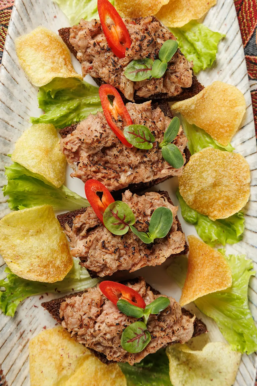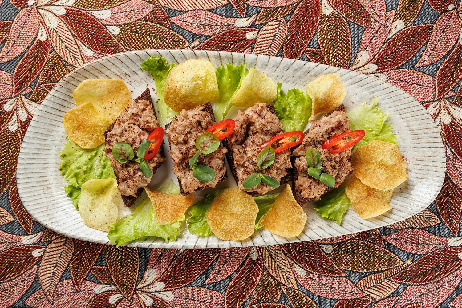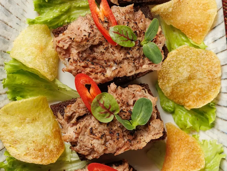Подаётся в виде трёх бутербродов. Основа блюда – вкуснейшая копчёная рыбка (дикий толстолобик с Нарочи – самого большого озера Беларуси). А также картофельные чипсы и жареный ржаной хлеб. Рыбу для нас, между прочим, коптит та же малая и дружная рыбацкая артель, которая её и ловит. Подбор щепы, времени и другие фирменные секреты обеспечивают рыбке изысканный и надолго запоминающийся вкус.