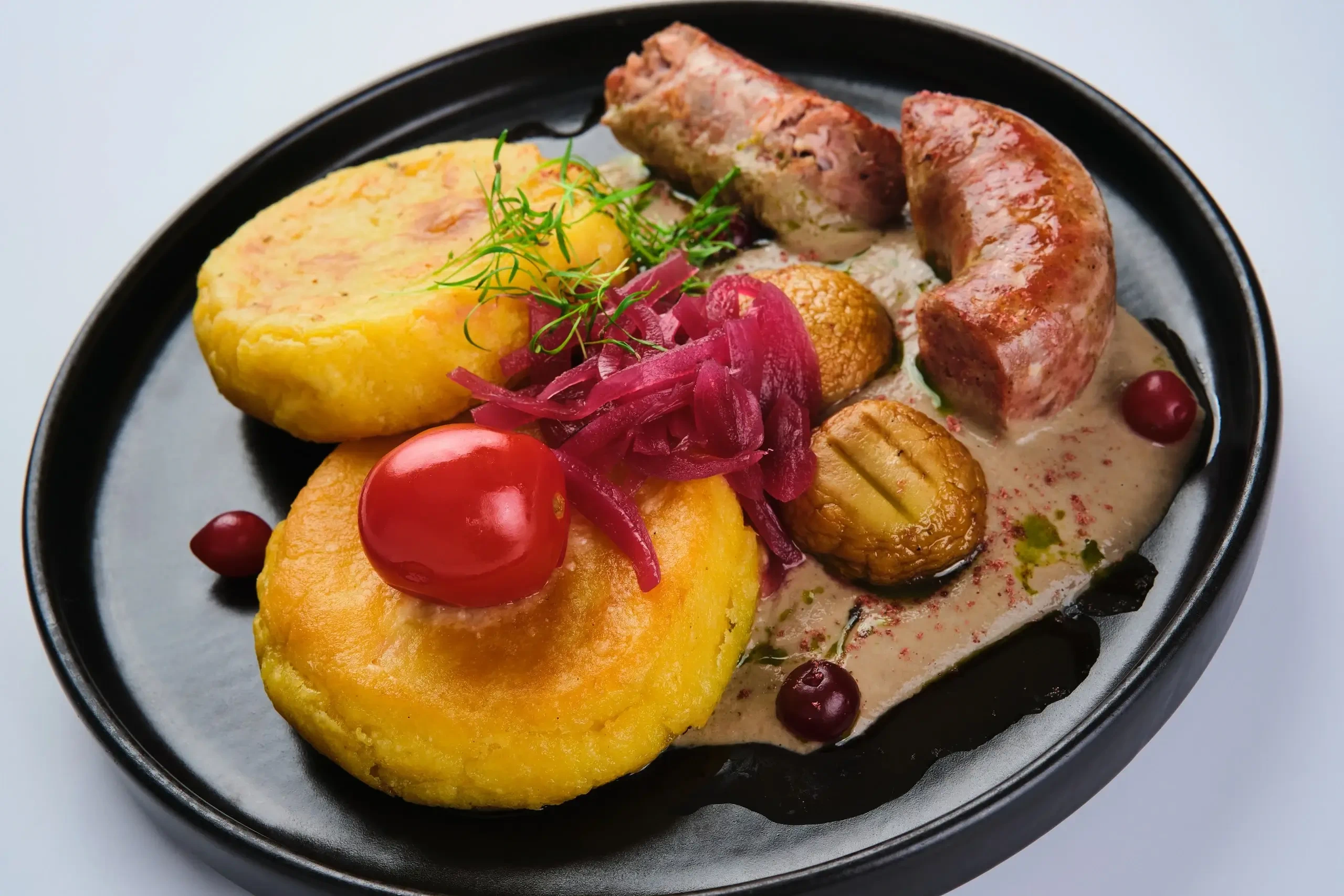 Прежде всего, нужно отварить и потолочь настоящий белорусский картофель. То есть, знаменитую «бульбу» 🙂 Затем, из готового и остывшего картофельного пюре, через гарнирное кольцо формируем «шайбы» стандартного размера. Которым руками аккуратно придаём овальную форму. Заметим, что сформировать бульбяники нужно быстро, пока пюре ещё не остыло. (Между прочим, в пюре мы добавляем яйцо и кипячёное молоко. Кроме того, можно также добавить соду на кончике ножа. При желании – пару ложек сметаны). Затем мы начиняем их золотистым обжаренным луком. И наконец, панируем в муке и обжариваем с двух сторон до образования золотисто-коричневой корочки. (Кстати, жарить бульбяники необходимо на небольшом количестве масла. Так они не получатся слишком жирными. А если всё же «переборщили», то стоит дать лишнему жиру впитаться. Например, в бумажное полотенце). Затем, нашу фирменную домашнюю колбасу из свинины мы обжариваем на гриле и доводим до кондиции в пароконвектомате. А тщательно вымытые шампиньоны разрезаем на половинки, оперативно маринуем и обжариваем. Ну, и обжариваем во фритюре свежие помидоры «черри».