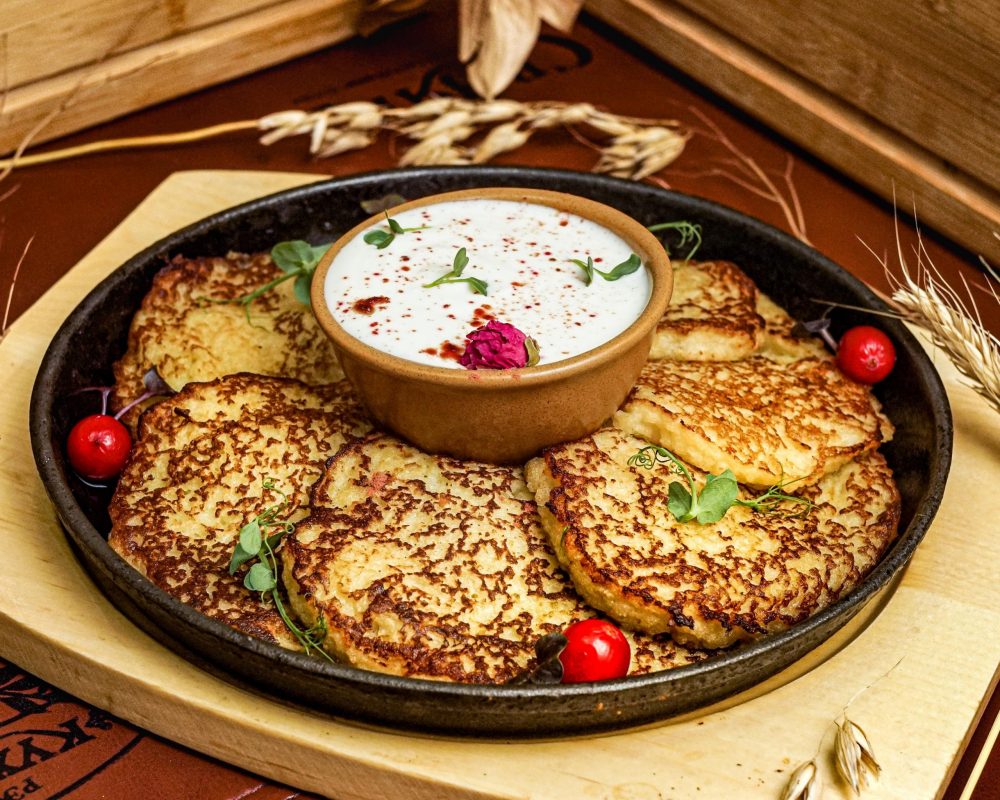 Драники по-домашнему со сметаной – один из столпов нашего меню на протяжении многих лет. Хотя в данный момент мы в таком виде их временно не готовим. Только в составе дегустационного сета драников. А как же без них? Ведь драники – самое известное из белорусских блюд, настоящий символ национальной кухни. Аналоги этих сковородных оладий из сырого тёртого картофеля есть во многих странах Северной и Восточной Европы. Но большинство белорусов уверены, что только в их стране, а точнее – в их семье, драники готовят правильно. Все считают себя истинными знатоками этого блюда. По всем нюансам рецептуры которого – никогда не утихнут жаркие споры. Добавлять ли в тесто муку? Едва ли не самый больной вопрос. А яйца-соду-уксус-лук? А насколько хрустящей и золотистой должна быть корочка? И какой сорт картофеля оптимальный?