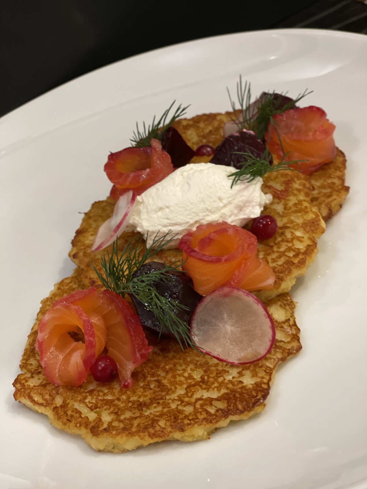 Draniki (potato fritters) with lightly salted salmon. Classic Belarusian potato fritters served with salmon pickled in beet juice, pickled beet and home made soft cheese