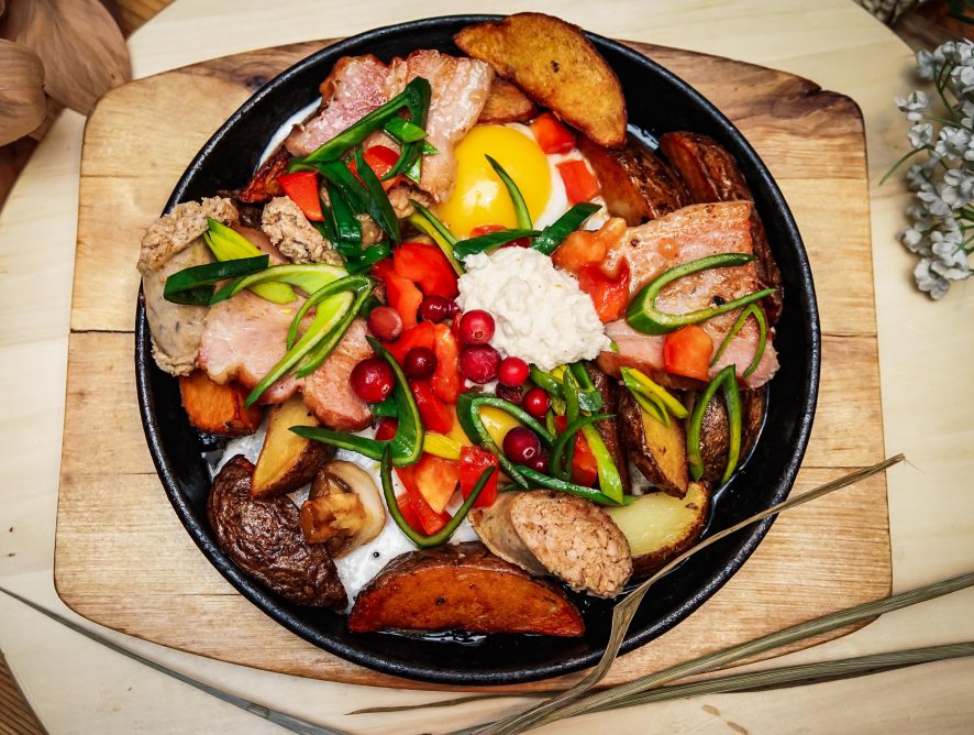 Как мы готовим это блюдо? Да очень просто: на порционную сковороду наливаем подсолнечное масло. Ставим на средней интенсивность огонь. Затем в центр вбиваем яйца. А по краю выкладываем обжаренный во фритюре картофель. Сверху последовательно выкладываем обжаренную домашнюю колбасу, грудинку, лук порей, шампиньоны, сладкий перец с соевым соусом. И слегка обжариваем, скорее хорошенько подогреваем. При подаче посыпаем клюквой, кладем также лук порей и хрен. Ну и наконец, умеренно солим и перчим. Итак, Ваша Горячая сковорода готова! И пожалуйста, подумайте как следует, не разделить ли Вам порцию с другом или даже двумя?