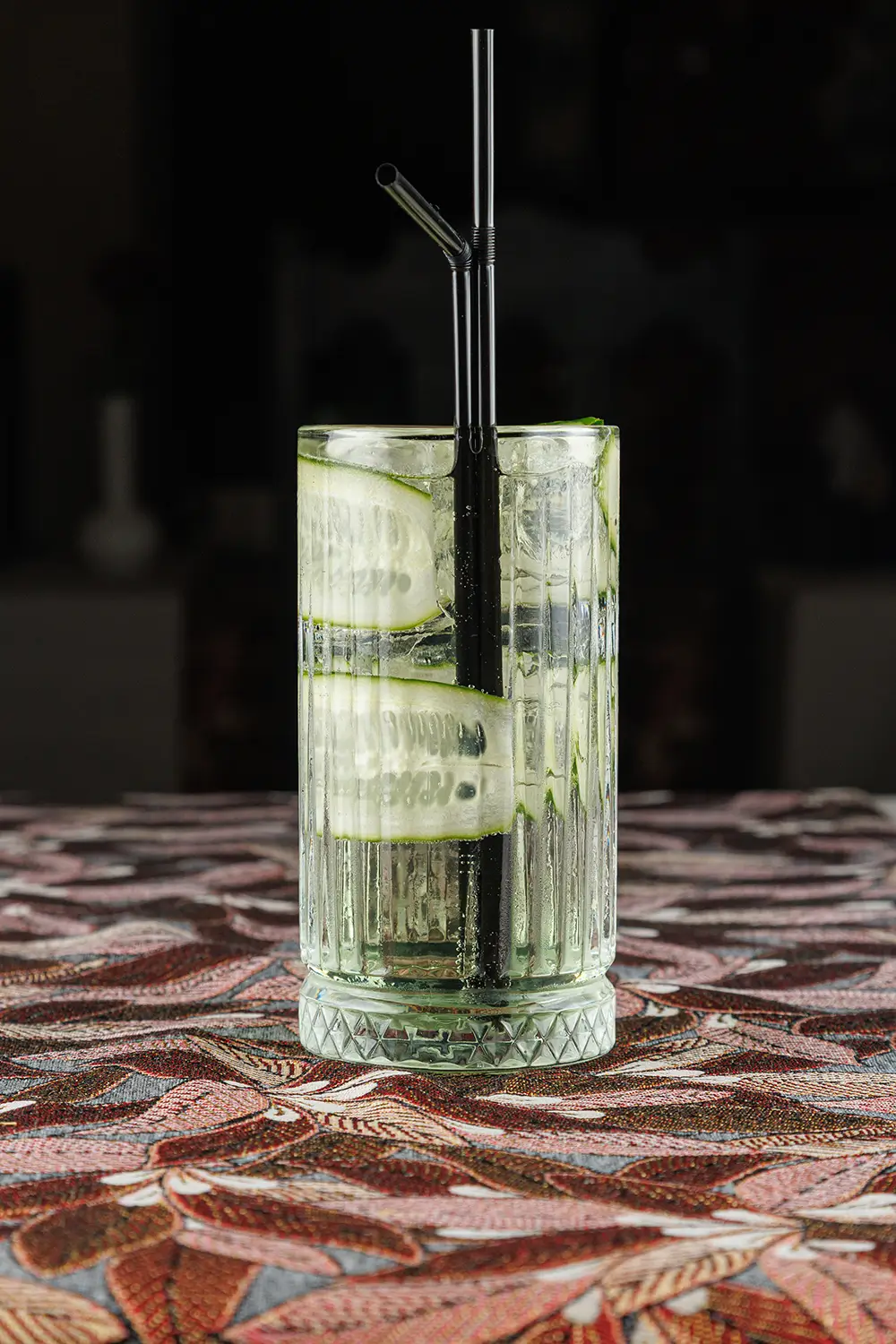 Коктейль «Огуречный джин-тоник» от Ресторана «Кухмистр». Состав: Джин, огуречный сироп, швепс, лайм, свежий огурец.