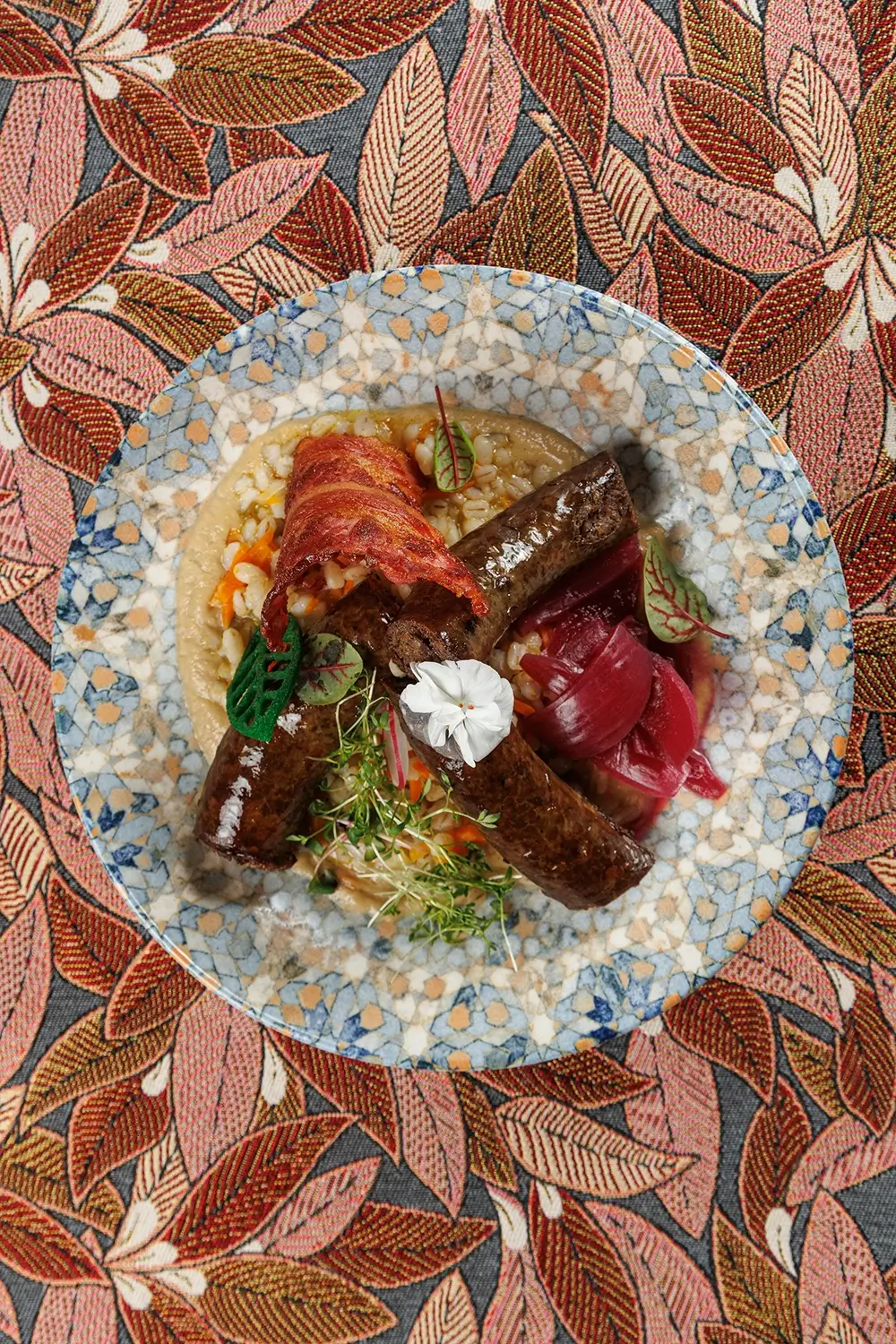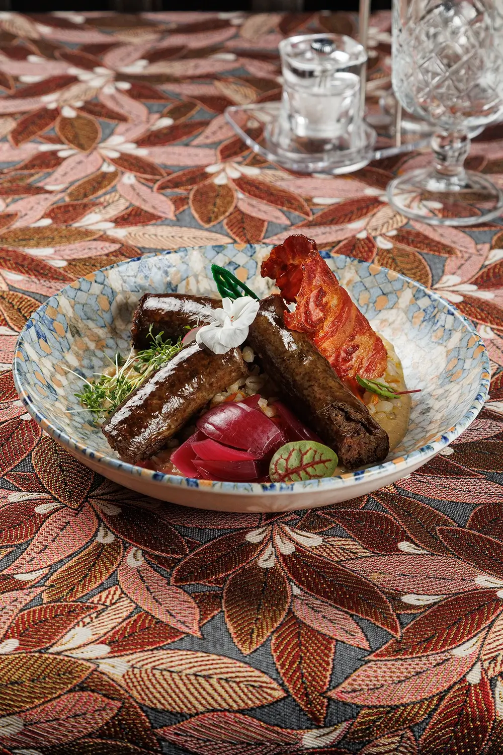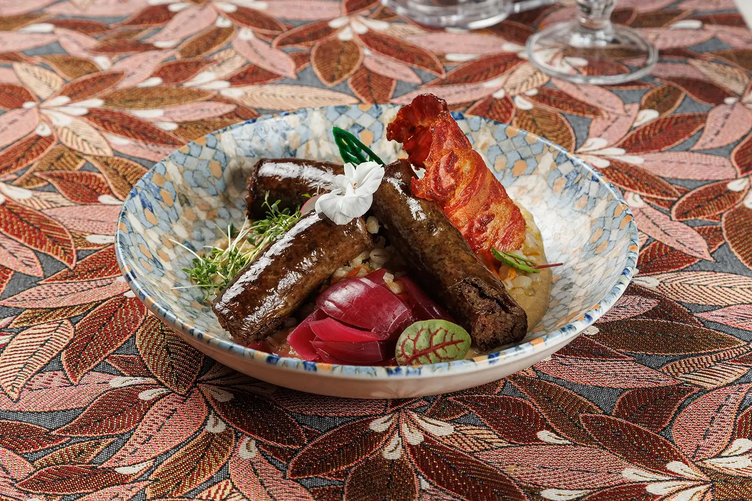 Колбаса из говяжьей печени «Потрошанка» подаётся с рассыпчатой перловой кашей и аппетитным соусом из печёных баклажан. Ещё раз, чтобы не запутаться, где какая каша 🙂 Гречневая – в самой колбасе (это делает её немного похожей на другое наше блюдо – гречаники). А перловая каша – на гарнир. Ну как, разобрались? Всё, на самом деле, очень просто 🙂 Это блюдо было в нашем меню с самого момента открытия ресторана – с июля 2011 года. И с тех пор рецептура практически не менялась. А зачем, если она проверена веками? Иногда мы обновляем рецепт соуса и какие-то нюансы подачи.