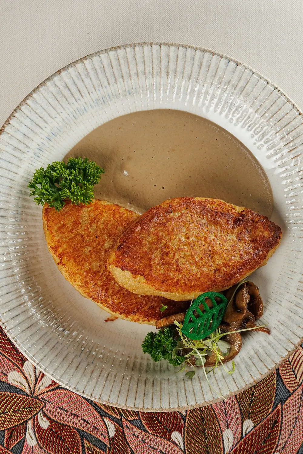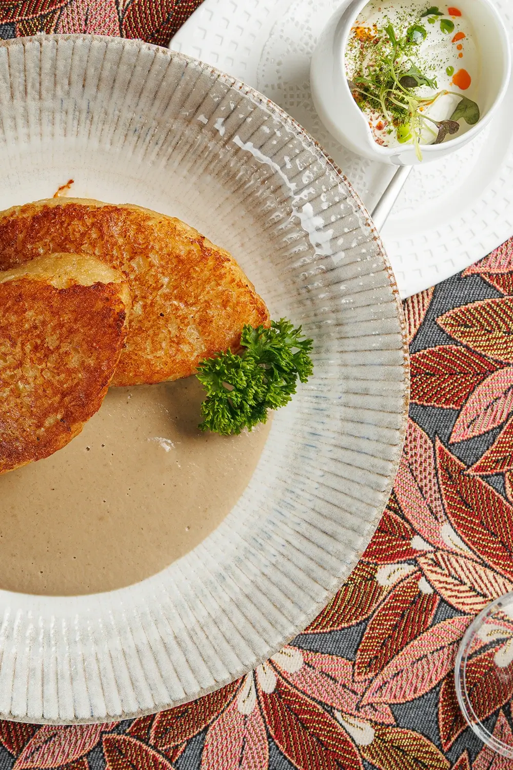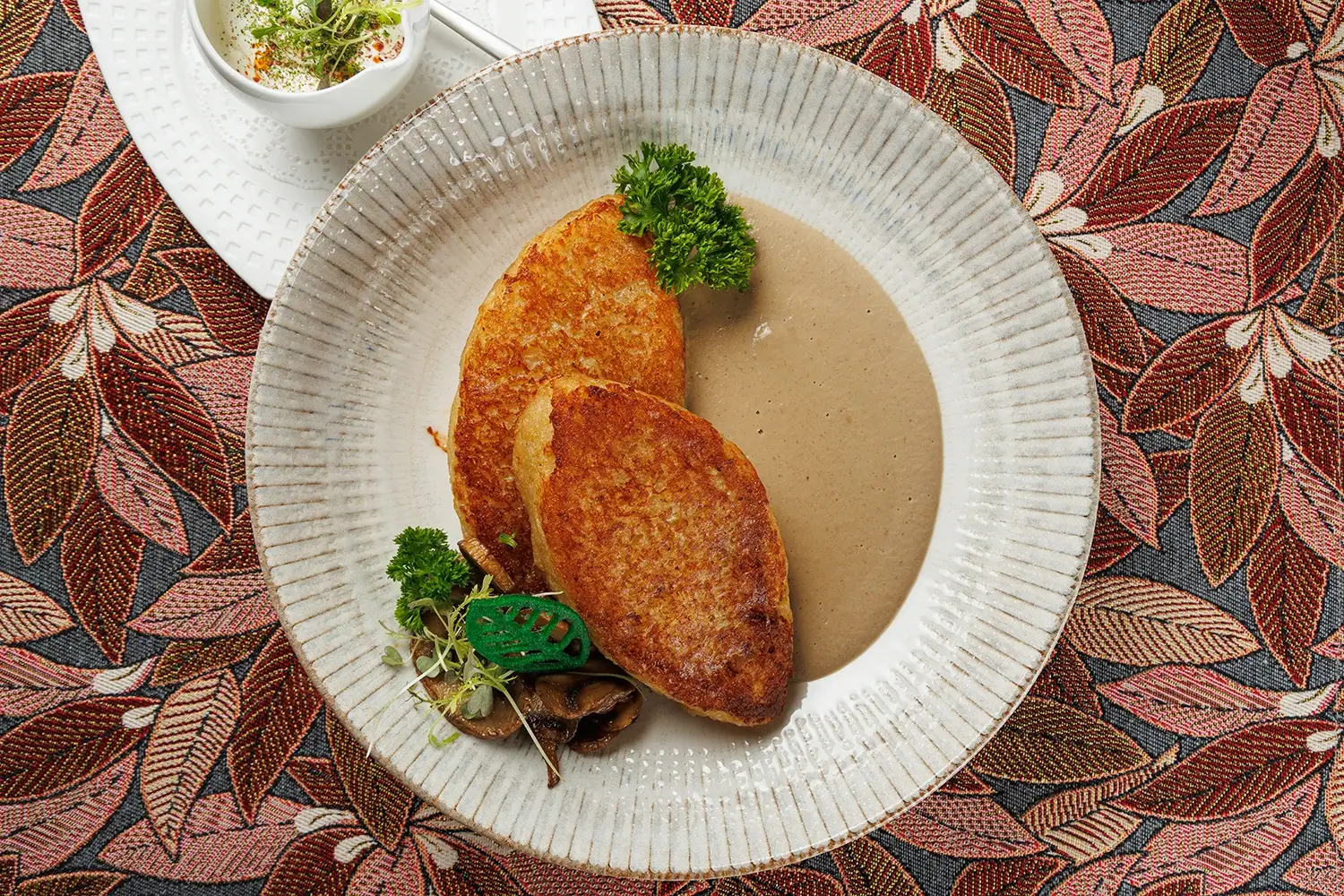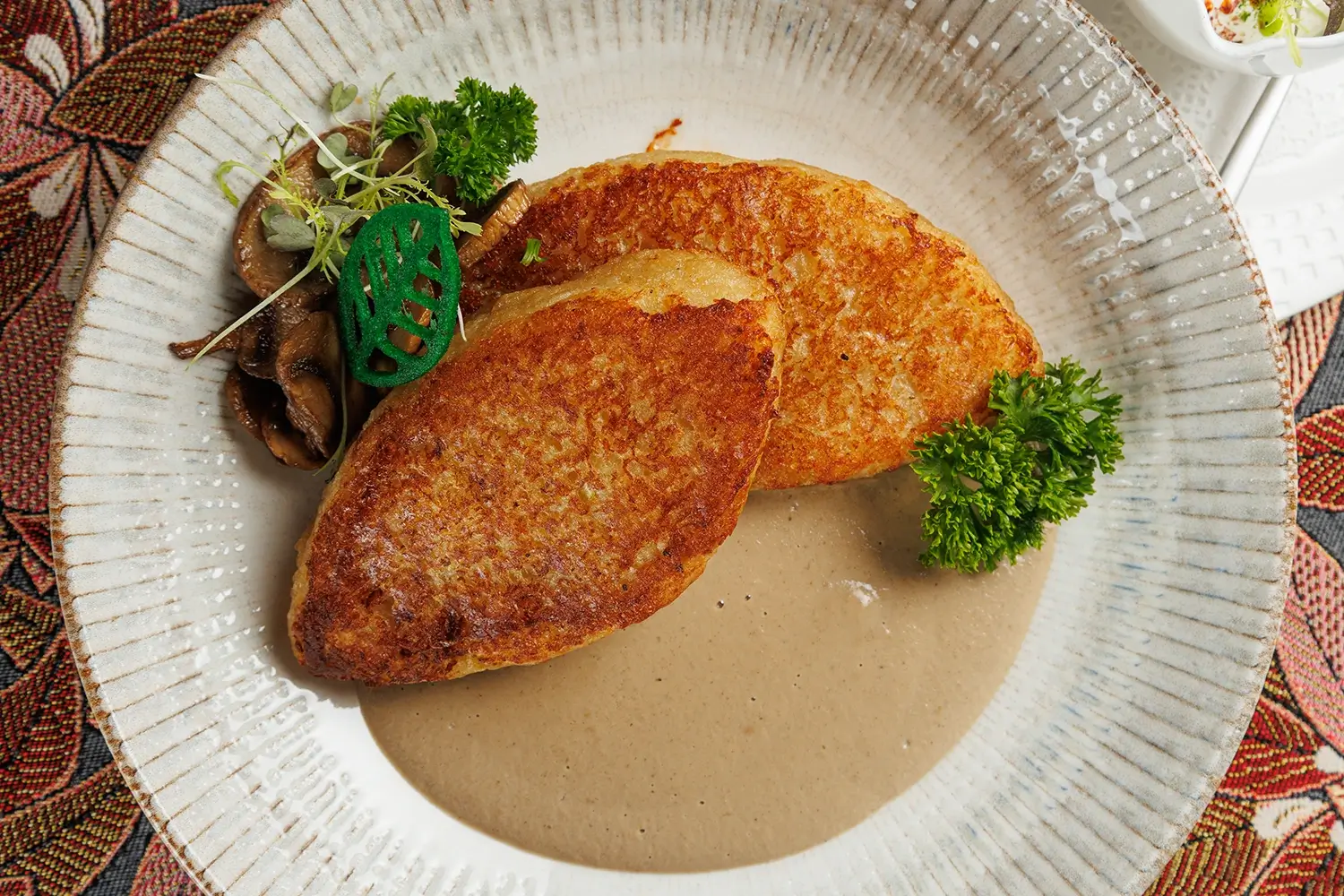 Колдуны “Вилейские “с грибным соусом и сметаной – блюдо, которое мы готовим с самого открытия ресторана. То есть с июля 2011 г. Изначально словом «колдуны» называли белорусско-литовский аналог пельменей и вареников. Заимствованный несколько веков назад из татарской кухни. И гораздо позже, в середине ХХ века, исходя из концептуального сходства, так в народе стали называть и большие картофельные клёцки («цеппелины»), и фаршированные драники. (Иначе говоря, картофельные оладьи). Фаршировать их можно рубленым мясом, шкварками, жареными грибами, иногда – творогом. О многозначности названия блюда “колдуны” в белорусской кухне – читайте подробную статью на нашем сайте.