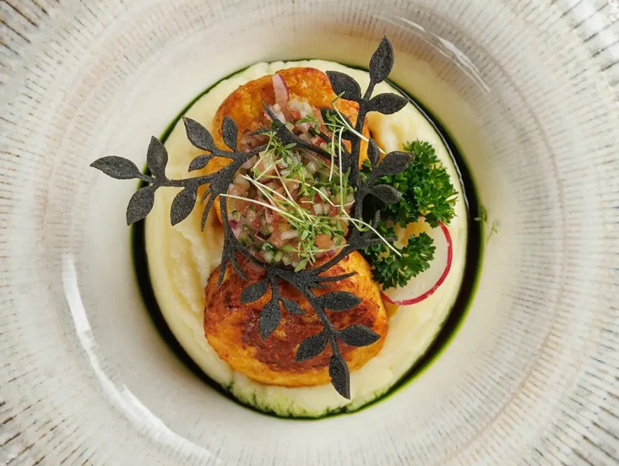 Котлетки из щуки «Кронон» с картофельным пюре и сальсой из овощей. Мы медленно, но неуклонно увеличиваем количество блюд из рыбы в нашем меню. Сознательно отдавая предпочтение белорусской – речной и озёрной. Ведь мы ресторан именно национальной кухни.