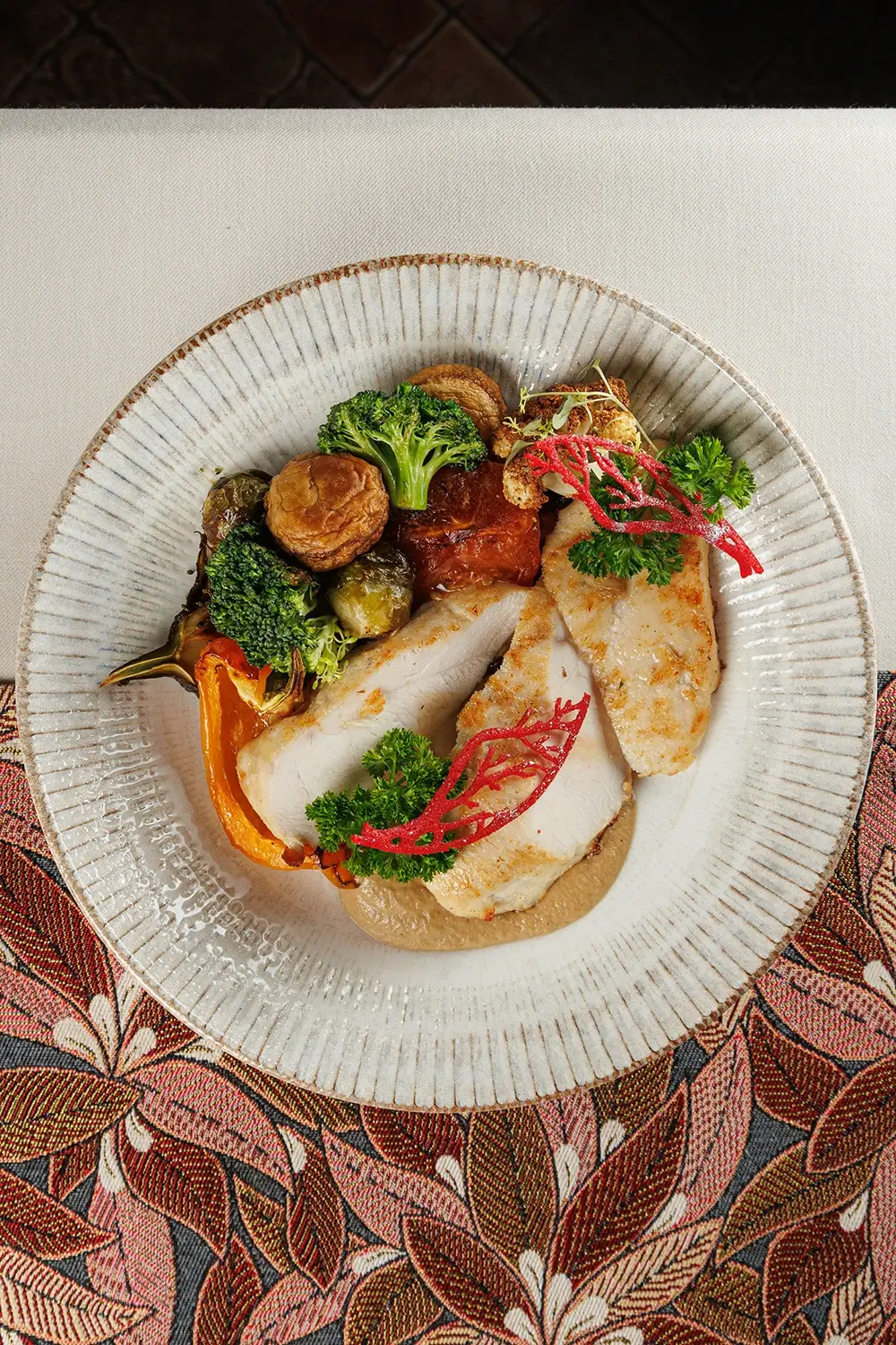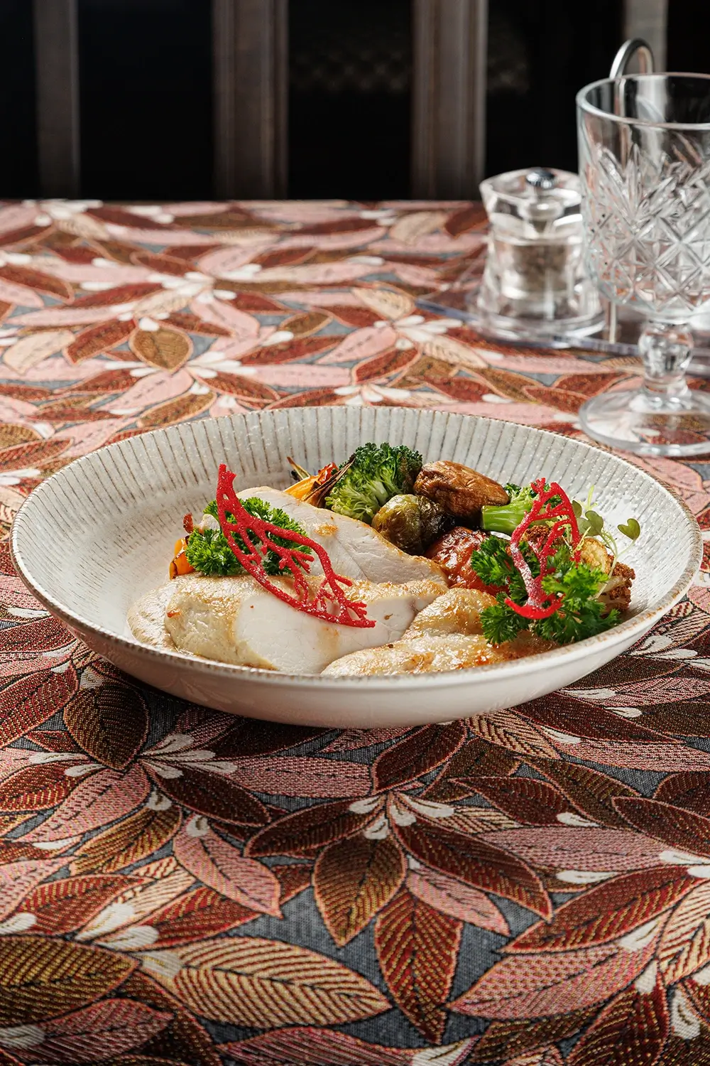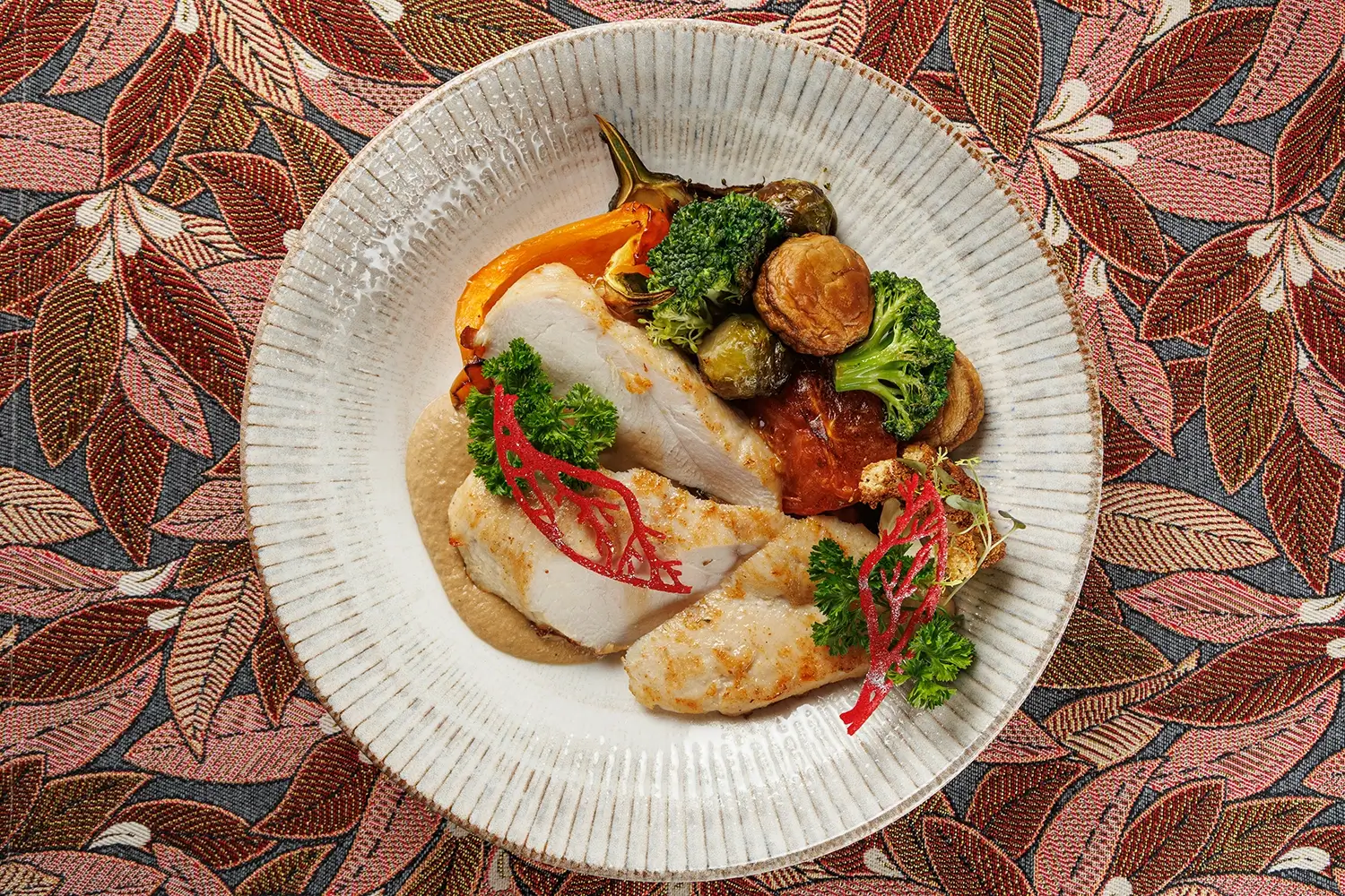 Куриная грудка с овощами – одно из самых диетических наших блюд. Деликатно обжаренная, она подаётся с сезонным гарниром из микса корнеплодов. (Например, топинамбура, репы, сельдере, брокколи, или других, по сезону), тыквы и т.д. Точный актуальный состав, пожалуйста, уточняйте у официанта .