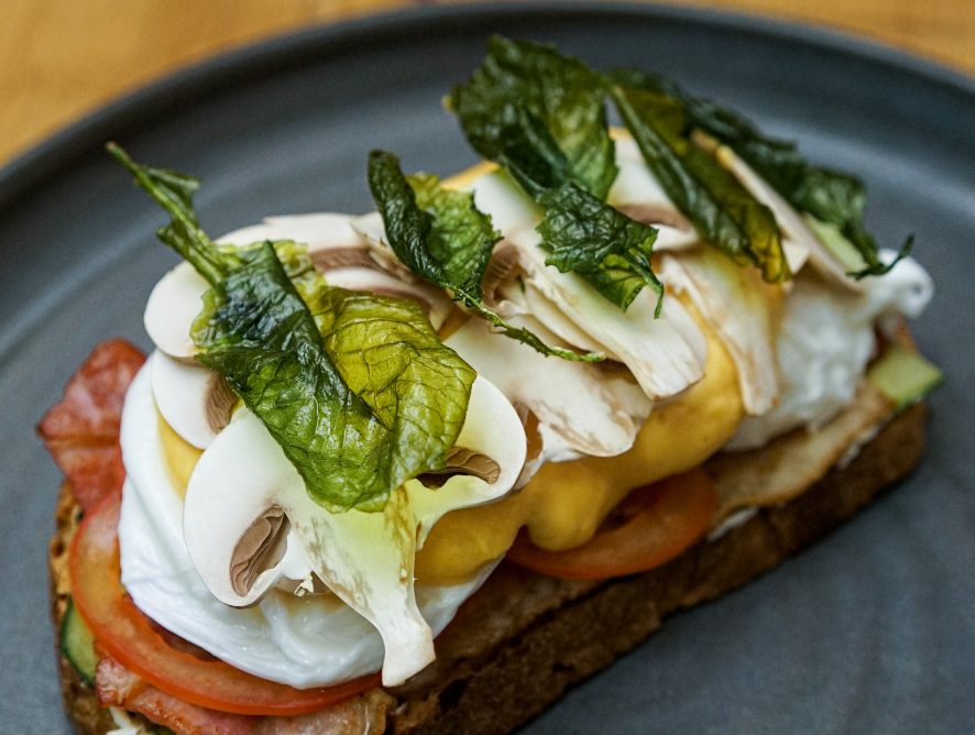 Луста утренняя с беконом – один из вариантов сытных комплексных завтраков в ресторане “Кухмистр”.