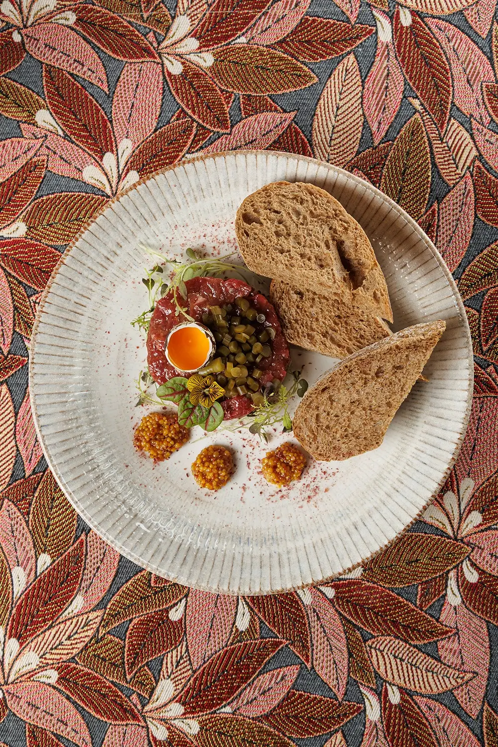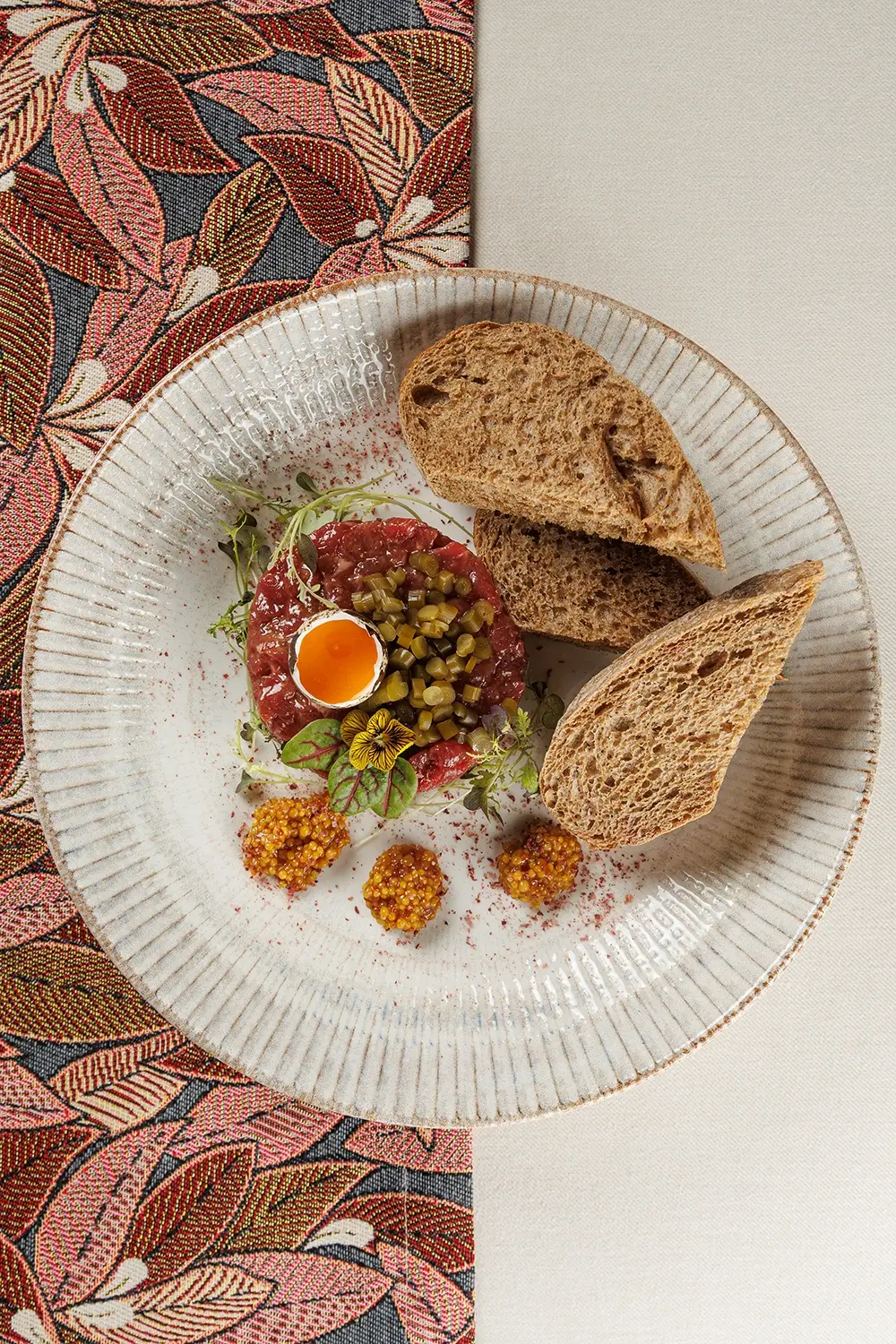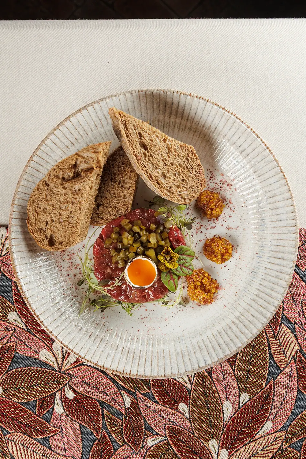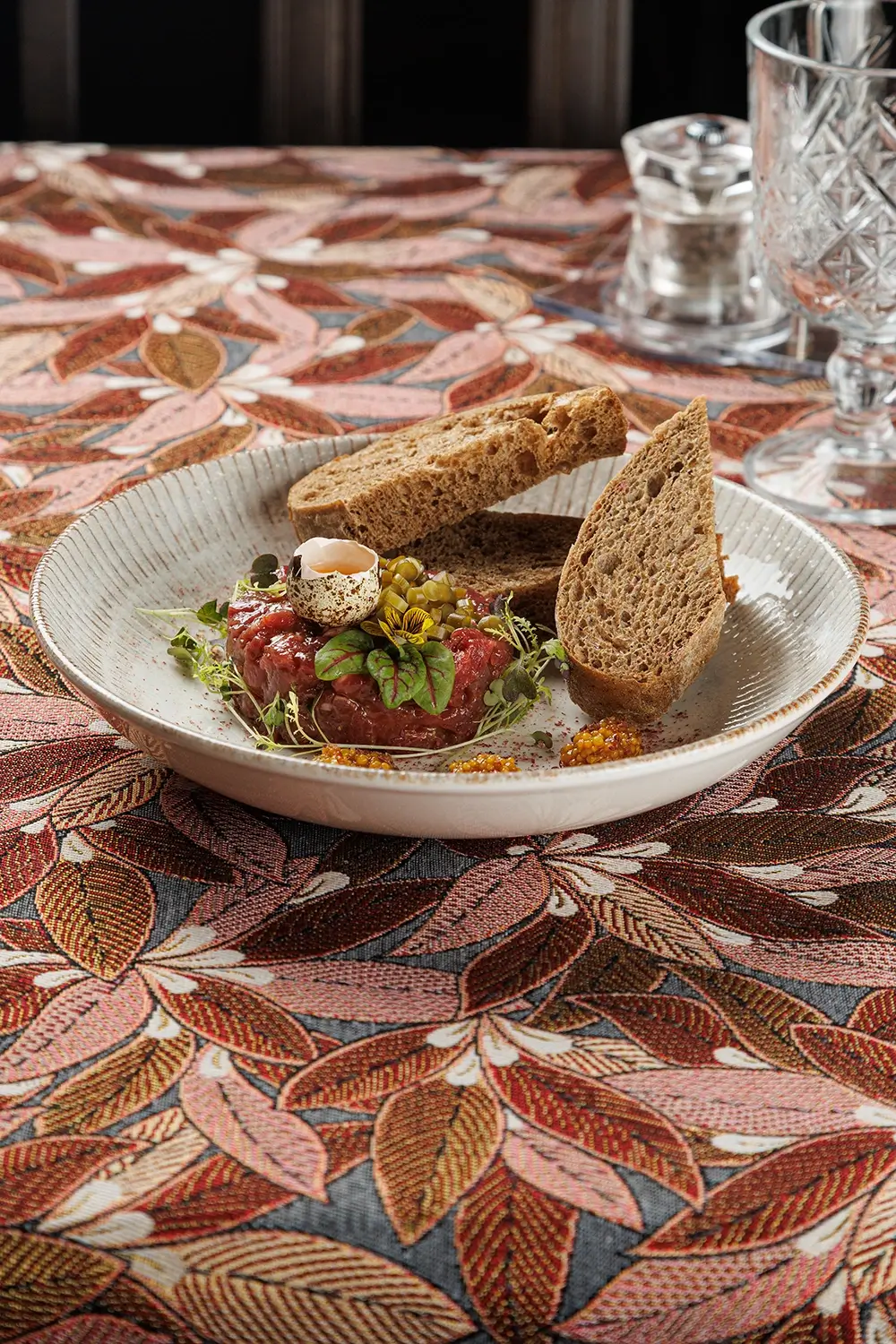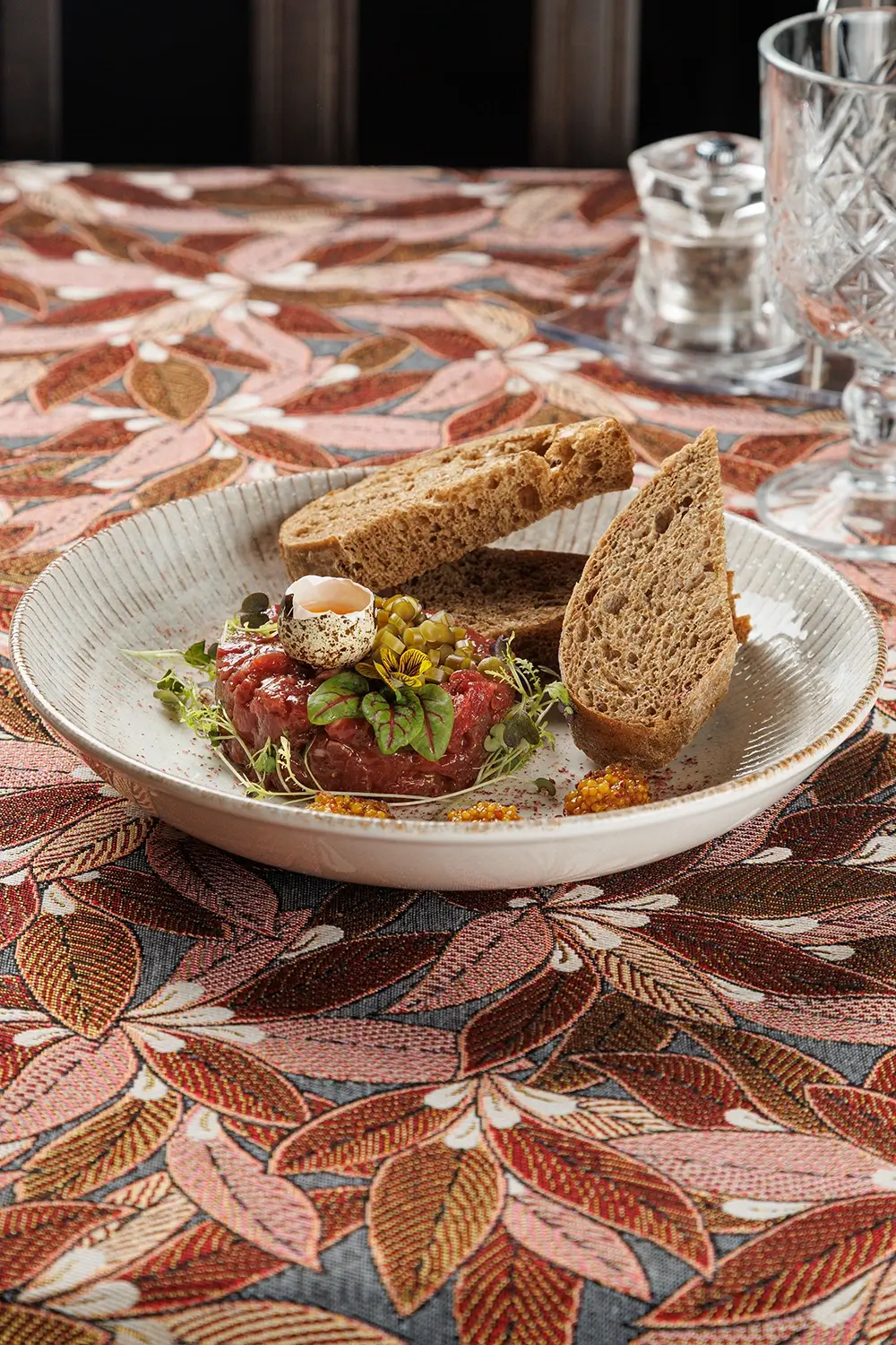 Мы готовим наш тартар из мелко нарезанных говядины и красного перца, с необходимым минимумом специй. По традиции, украшаем желтком (перепелиного яйца). И подаём с оригинальным сладковатым соусом, луковыми кольцами и черемшой, на поджаренном тёмном ржаном хлебе. В таком исполнении, эта закуска приобретает неожиданную глубину вкуса и смысловых ассоциаций. У нас даже есть несколько преданных фанатов, которые регулярно приходят именно отведать тартар!