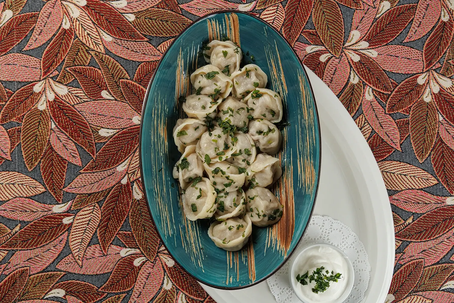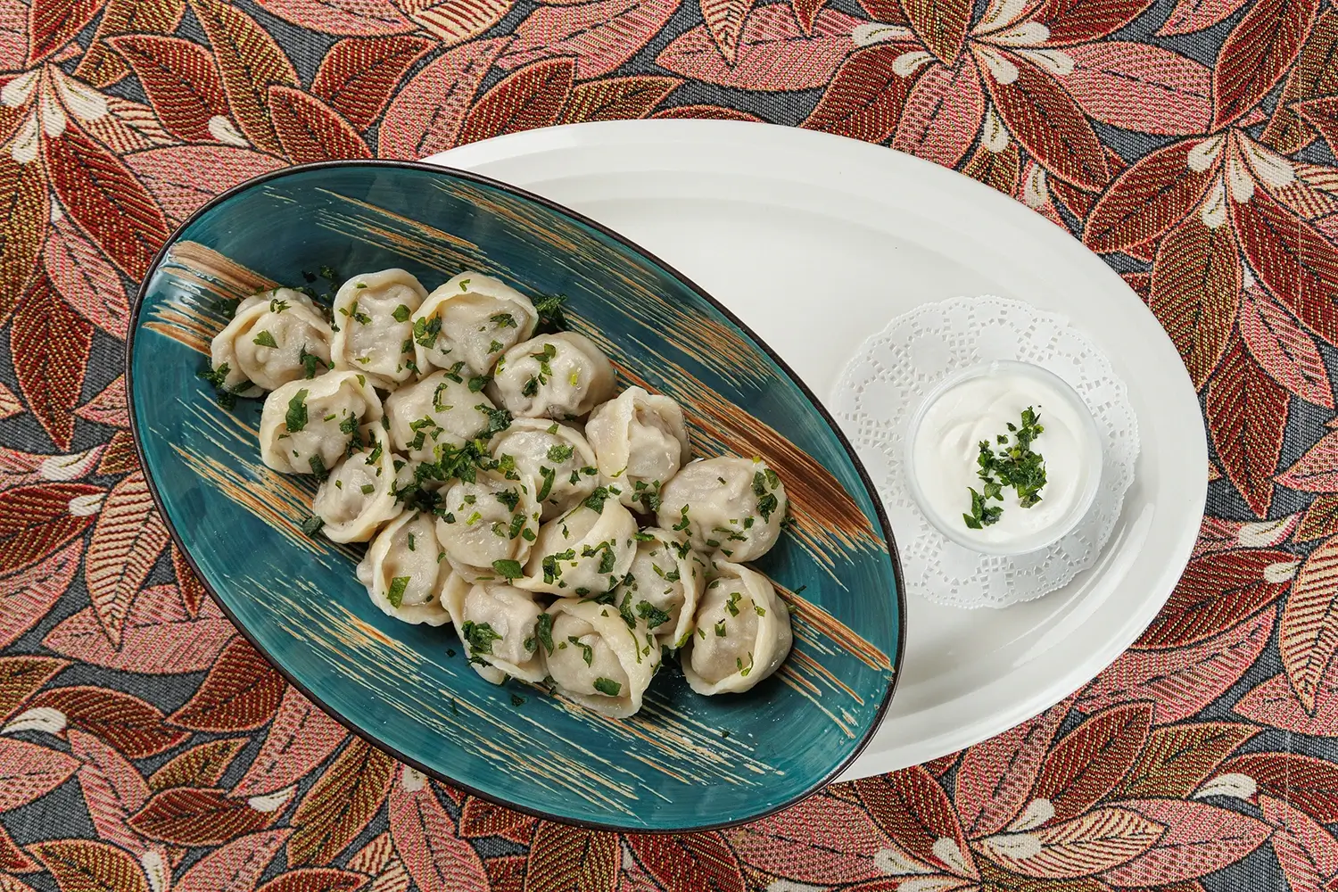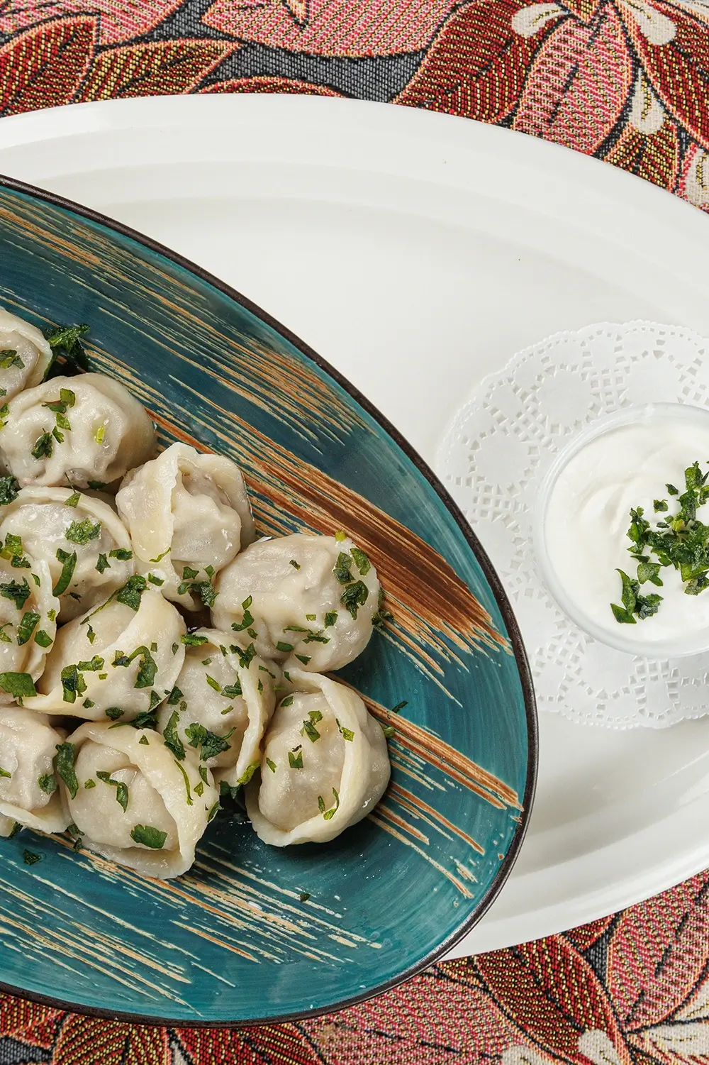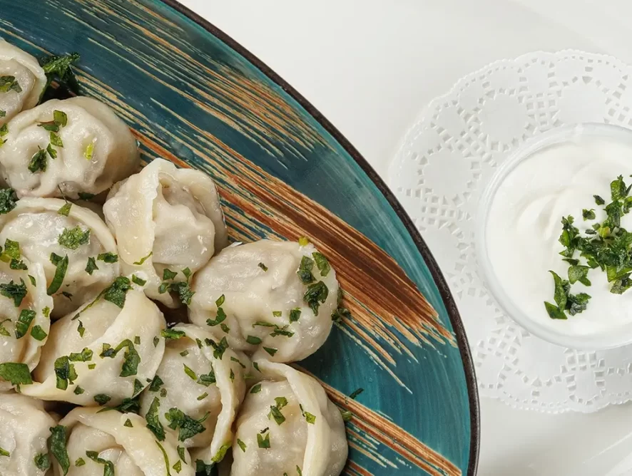 Татарские колдуны с бараниной, кинзой и чесночно-сметанным соусом
