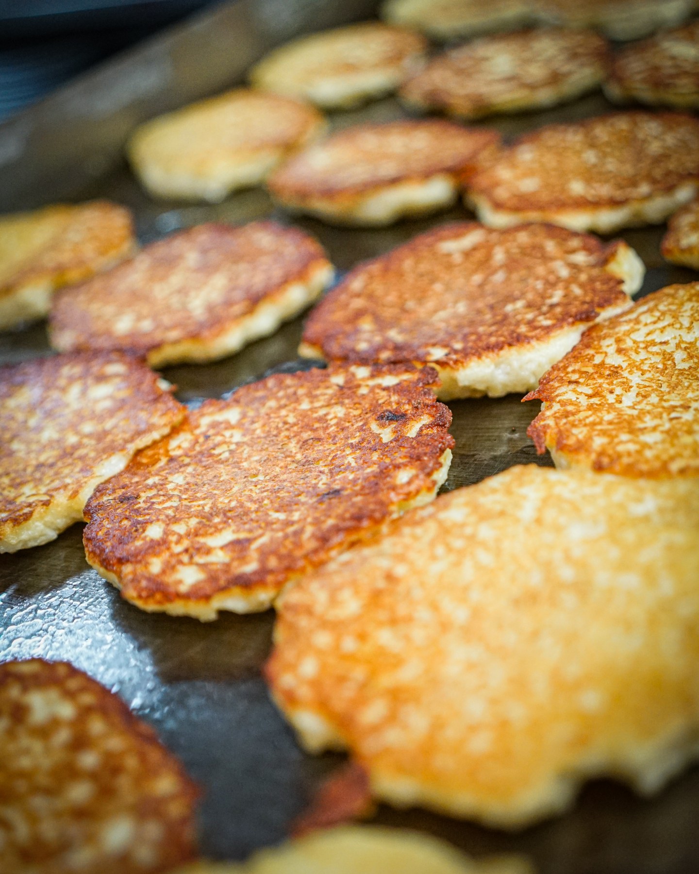 Жарим не на сковороде, а на планче, на смеси растительного и сливочного масла. Планча – это испанское слово, в переводе означающее – «пластина», «доска», «лист». Такая большая, плоская, металлическая жарочная поверхность. Совершенно обязательный элемент оборудования любого современного ресторана. Заменяющая в том числе и гриль. Много масла на такую поверхность не нальёшь – оно попросту стечёт. (Кстати, мы используем смесь подсолнечного и сливочного масла). Но и совсем сухими драники при такой технологии не выходят. Как раз оптимальными – слава Богу, с точки зрения абсолютного большинства наших гостей. Одна столовая ложка теста – один драник. И причём на планче это печётся очень быстро, только успевай поворачиваться. Ведь температура поддерживается всё время очень высокой, 300-320 градусов. Вот и весь секрет! Да, и при нашем объёме заказов нужно каждый день сделать 3-5 замесов теста. А иногда и больше. На следующий день никогда ничего не оставляем. При этом драники, конечно, жарятся только под конкретные заказы из зала. Ни в коем случае не про запас. Впрочем, это общий принцип приготовления всех наших блюд.